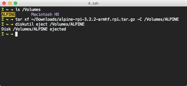 sudo tar xf ~/Downloads/alpine-rpi-[...]-armhf.rpi.tar.gz -C /Volumes/ALPINE - Eject disk, it should now be ready to be used in the Raspberry Pi