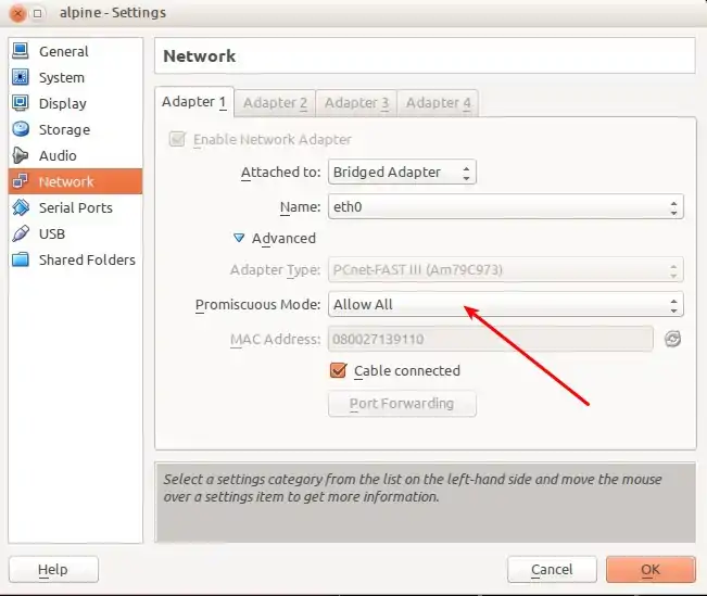 In order for the network to work on containers, you need to set "Promiscuous Mode" to "Allow All" in VirtualBox settings for the network adapter.