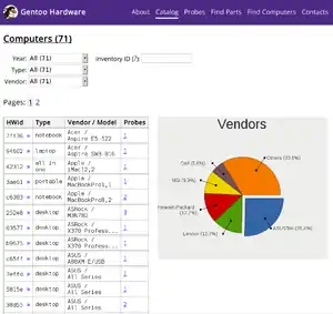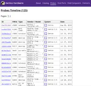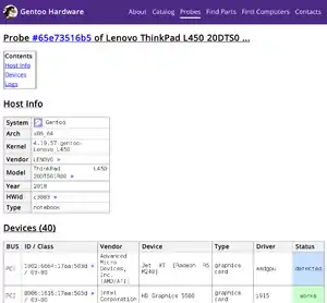 The Gentoo Hardware Database is automatically created based on hardware probes collected by sys-apps/hw-probe, by hw-probe.AppImage and this flatpak.