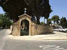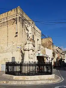 A statue of Saint Sebastian, a patron saint of the plague-stricken, was erected on the outskirts of Qormi (facing Marsa and the harbour) after the outbreak. The statue was sculpted by Ċikku and Girolamo Fabri (although it sometimes attributed to Vincenzo Dimech), and an inscription commemorates that it was given an indulgence in 1816.[48] In the 1880s, a church dedicated to the same saint was built near the statue, and it became a separate parish in 1935. A much larger parish church was built nearby later on in the 20th century.[45]