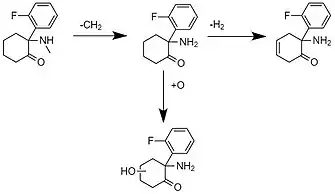 The metabolism of 2-FDCK is analogous to that of ketamine: the enzymes CYP2B6 and CYP3A4, the latter to a lesser extent, metabolise 2-FDCK to Nor-2FDCK via N-demethylation. This is further metabolised either to dehydronor-2FDCK by CYP2B6 or to hydroxynor-2FDCK by CYP2A6 and CYP2B6.[3]