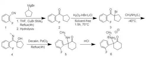 2-FDCK can be synthesized in a five-step reaction process.[1] First 2-fluorobenzonitrile reacts with the Grignard reagent cyclopentyl magnesium bromide followed by a bromination reaction to obtain α-bromocyclopentyl-(2-fluorophenyl)-ketone. The reaction of the obtained ketone with methylamine at -40°C then results in the formation of α-hydroxycyclopentyl-(2-fluorophenyl)-N-methylamine. Finally, the five-membered ring cyclopentanol form is expanded to a cyclohexylketone form by a thermal rearrangement reaction. HCl is used to create a water-soluble HCl salt of 2-FDCK.