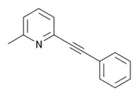 2-Methyl-6-(phenylethynyl)pyridine (MPEP) is a research drug which was one of the first compounds found to act as a selective antagonist for the metabotropic glutamate receptor subtype mGluR5. After being originally patented as a liquid crystal for LCDs, it was developed by the pharmaceutical company Novartis in the late 1990s.[1] It was found to produce neuroprotective effects following acute brain injury in animal studies, although it was unclear whether these results were purely from mGluR5 blockade as it also acts as a weak NMDA antagonist,[2][3] and as a positive allosteric modulator of another subtype mGlu4,[4] and there is also evidence for a functional interaction between mGluR5 and NMDA receptors in the same populations of neurons.[5] It was also shown to produce antidepressant[6][7][8] and anxiolytic effects in animals,[9][10][11] and to reduce the effects of morphine withdrawal,[12] most likely due to direct interaction between mGluR5 and the μ-opioid receptor.[13]
