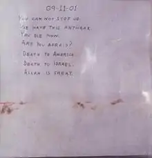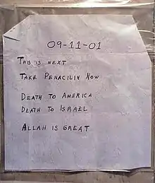 Also unconnected to the anthrax attacks was a large envelope received at American Media, Inc., in Boca Raton, Florida (which was among the victims of the attacks) in September 2001. It was addressed "Please forward to Jennifer Lopez c/o The Sun", containing a metal cigar tube with a cheap cigar inside, an empty can of chewing tobacco, a small detergent carton, pink powder, a Star of David pendant, and "a handwritten letter to Jennifer Lopez. The writer said how much he loved her and asked her to marry him."[37] Another letter, which mimicked the original anthrax letter to Senator Daschle, was mailed to Daschle from London in November 2001, at a time when Hatfill was in England, not far from London.[38][39][40] Shortly before the discovery of the anthrax letters, someone sent a letter to authorities stating, "Dr. Assaad is a potential biological terrorist."[41] No connection to the anthrax letters was ever found.[42]