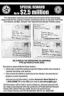The 2001 anthrax attacks, also known as Amerithrax (a portmanteau of "America" and "anthrax") from its FBI case name,[3] occurred in the United States over the course of several weeks beginning on September 18, 2001, one week after the September 11 terrorist attacks. Letters containing anthrax spores were mailed to several news media offices and to Democratic Senators Tom Daschle and Patrick Leahy, killing five people and infecting 17 others. According to the FBI, the ensuing investigation became "one of the largest and most complex in the history of law enforcement".[4]