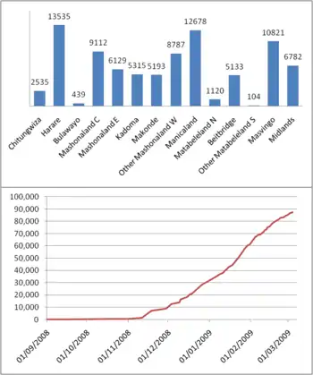The 2008 Zimbabwean cholera outbreak was an epidemic of cholera affecting much of Zimbabwe from August 2008 until June 2009. The outbreak began in Chitungwiza in Mashonaland East Province in August 2008, then spread throughout the country so that by December 2008, cases were being reported in all 10 provinces.[6] In December 2008, The Zimbabwean government declared the outbreak a national emergency and requested international aid.[7] The outbreak peaked in January 2009 with 8,500 cases reported per week.[8] Cholera cases from this outbreak were also reported in neighboring countries South Africa, Malawi, Botswana, Mozambique, and Zambia.[8] With the help of international agencies, the outbreak was controlled, and by July 2009, after no cases had been reported for several weeks, the Zimbabwe Ministry of Health and Child Welfare declared the outbreak over.[8] In total, 98,596 cases of cholera and 4,369 deaths were reported, making this the largest outbreak of cholera ever recorded in Zimbabwe.[8] The large scale and severity of the outbreak has been attributed to poor sanitation, limited access to healthcare, and insufficient healthcare infrastructure throughout Zimbabwe.[8][9]
