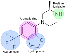 In the drug discovery process of a 5-HT2C agonist, a pharmacophore module has been used to discover novel 5-HT2C receptor ligands. The pharmacophore has four features; one aromatic ring, two hydrophobic features and one positive ionizable feature. Figure 4 shows an example of a compound that fits the agonist pharmacophore perfectly. The nitrogen atom of piperazine fits the positive ionizable feature, the benzofuran part fits the aromatic ring and one hydrophobic, and the trifluoromethane part fits another hydrophobic feature of the pharmacophore.[30]