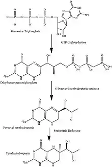 This image depicts the pathway for the synthesis if tetrahydrobiopterin, a very important cofactor in the human body.