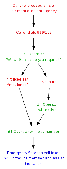 On dialling 999 or 112 an operator will answer and ask, "Emergency. Which service?"[30] Previously operators asked "Which service do you require?" (approximately up to the mid-90s).