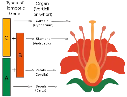 The identity of the organs present in the four floral verticils is a consequence of the interaction of at least three types of gene products, each with distinct functions. According to the ABC model, functions A and C are required in order to determine the identity of the verticils of the perianth and the reproductive verticils, respectively. These functions are exclusive and the absence of one of them means that the other will determine the identity of all the floral verticils. The B function allows the differentiation of petals from sepals in the secondary verticil, as well as the differentiation of the stamen from the carpel on the tertiary verticil.