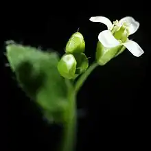 The meristem can be defined as the tissue or group of plant tissues that contain undifferentiated stem cells, which are capable of producing any type of cell tissue. Their maintenance and development, both in the vegetative meristem or the meristem of the inflorescence is controlled by genetic cell fate determination mechanisms. This means that a number of genes will directly regulate, for example, the maintenance of the stem cell's characteristics (gene WUSCHEL or WUS), and others will act via negative feedback mechanisms in order to inhibit a characteristic (gene CLAVATA or CLV). In this way both mechanisms give rise to a feedback loop, which along with other elements lend a great deal of robustness to the system.[6] Along with the WUS gene the SHOOTMERISTEMLESS (STM) gene also represses the differentiation of the meristematic dome. This gene acts by inhibiting the possible differentiation of the stem cells but still allows cell division in the daughter cells, which, had they been allowed to differentiate, would have given rise to distinct organs.[7]