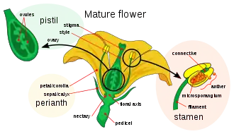 A flower's anatomy, as defined by the presence of a series of organs (sepals, petals, stamens and carpels) positioned according to a given pattern, facilitate sexual reproduction in flowering plants. The flower arises from the activity of three classes of genes, which regulate floral development: genes which regulate the identity of the meristem, the identity of the flower organ and finally cadastral genes.[8]