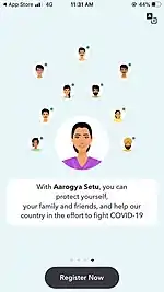 Aarogya Setu (translation from Sanskrit: the bridge to liberation from disease) is an Indian COVID–19 "contact tracing, syndromic mapping and self-assessment" digital service, primarily a mobile app, developed by the National Informatics Centre under the Ministry of Electronics and Information Technology (MeitY). The app reached more than 100 million installs in 40 days. On 26 May, amid growing privacy and security concerns, the source code of the app was made public.[3]