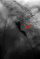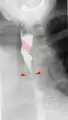 Tape-like impression of the esophagus caused by aberrant subclavian artery. Below (arrows) narrowing of the esophagus by a tumor that is causing the swallowing problems.
