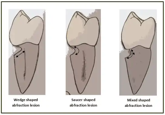 When looking at abfraction lesions there are generally three shapes in which they appear, appearing as either wedge, saucer or mixed patterns.[6] Wedge and saucer shaped lesions are the most common, whereas mixed lesions are less frequently identified in the oral cavity.[6] In reference to figure 1, wedge shaped lesions have the sharpest internal line angles and saucer/mixed shaped lesions are either smooth internally, or a variety.