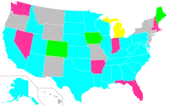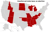 Abortion in the United States is legal, subject to balancing tests tying state regulation of abortion to the three trimesters of pregnancy, via the landmark 1973 case of Roe v. Wade, the first abortion case to be taken to the Supreme Court. Every state has at least one abortion clinic.[1][2] However, individual states can regulate/limit the use of abortion or create "trigger laws", which would make abortion illegal within the first and second trimesters if Roe were overturned by the Supreme Court of the United States[3][4][5] Also, nine states—Alabama, Arizona, Arkansas, Michigan, Mississippi, New Mexico, Oklahoma, West Virginia and Wisconsin still have their unenforced pre-Roe abortion bans on the lawbooks, which could start being enforced if Roe were overturned.[4] In accordance with the US Supreme Court case of Planned Parenthood v. Casey (1992), states cannot place legal restrictions posing an undue burden for "the purpose or effect of placing a substantial obstacle in the path of a woman seeking an abortion of a nonviable fetus."[6]