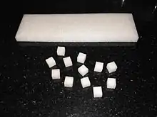 An absorbable gelatin sponge is a sterile hemostatic agent composed of purified porcine-derived gelatin. In regional chemotherapy, absorbable gelatin sponge may be used to embolize arteries in the region of a tumor in order to block or retard blood flow; this blockage results in a locally increased concentration of chemotherapeutic agents delivered to the tumor when chemotherapeutic agents are infused into the embolized arterial circulation upstream of the blockage.[1] It is sometimes soaked with buprenorphine.[2] It is placed directly on the wound's base and helps create a clot in the blood. To cover it and keep it in place, another bandage is placed on top of the dressing.