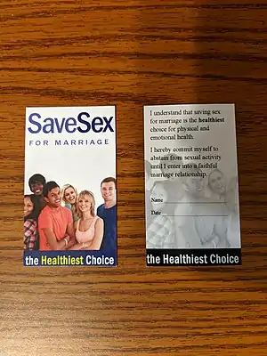 Abstinence pledges are commitments made by people, often though not always teenagers and young adults, to practice abstinence, usually in the case of practicing teetotalism with respect to abstaining from alcohol and other drugs, or chastity, with respect to abstaining from sexual intercourse until marriage; in the latter case, they are sometimes also known as purity pledges or virginity pledges.[1][2][3] They are most common in the United States among Catholic and Evangelical Christian denominations, while others are nonsectarian.[1][4]
