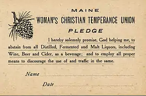 The temperance movement arose in the 18th century and spread throughout Christians of the Methodist, Presbyterian, Quaker, and Roman Catholic denominations, among others.[1] The Woman's Christian Temperance Union (WCTU), has encouraged people in their communities to sign abstinence pledges with the undersigned promising to not use alcohol or other drugs; the following is an example of wording that may appear on such abstinence pledge cards: "I hereby promise, by the help of God, to abstain from the use of all intoxicating liquors, including wine, beer, and cider as a beverage."[5] Taking the abstinence pledge enrolls those signing the cards as members in the temperance organization that is distributing them, such as the Woman's Christian Temperance Union, Independent Order of Rechabites and International Organisation of Good Templars, among others.[2] The Catholic Total Abstinence League of the Cross, founded by Cardinal Henry Manning in 1873, had the following pledge: "I promise to you, reverend father, and to the League of the Holy Cross, by the help of God’s grace, to abstain from all intoxicating drinks."[6] A similar organisation, the Pioneer Total Abstinence Association, continues distributing abstinence pledges today and Pope Pius X instated an plenary indulgence of 100 days for those promoting it.[7] In Ireland, it is common for school children to take the pledge of the Pioneer Total Abstinence Association after which they receive a lapel pin.[8]