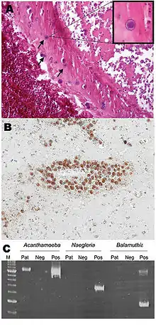 - Di Gregorio C, Rivasi F, Mongiardo N, De Rienzo B, Wallace S, Visvesvara GS (December 1992). "Acanthamoeba meningoencephalitis in a patient with acquired immunodeficiency syndrome". Archives of Pathology & Laboratory Medicine. 116 (12): 1363–5. PMID 1456885.