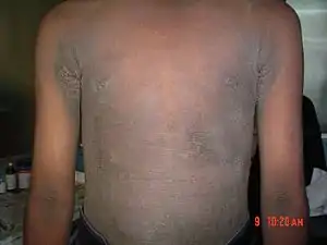 Acanthosis nigricans may present with thickened, velvety, relatively darker areas of skin on the neck, armpit and in skin folds.[3]