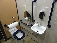 - a wheelchair-height toilet, to help the user on and off the toilet, with handles (grab bars);