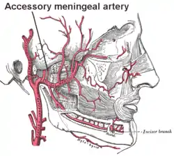 The accessory meningeal artery (also accessory branch of middle meningeal artery, pterygomeningeal artery, small meningeal or parvidural branch) is a branch of the maxillary artery, sometimes derived from the middle meningeal artery.