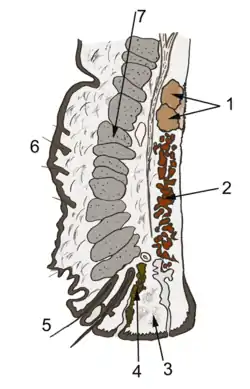 Krause's glands, Wolfring's glands (or Ciaccio's glands) and Popov's gland are the accessory lacrimal glands of the lacrimal system of human eye.[1] These glands are structurally and histologically similar to the main lacrimal gland. Glands of Krause are located in the stroma of the conjunctival fornix, and the glands of Wolfring are located along the orbital border of the tarsal plate.[2] These glands are oval and display numerous acini. The acini are surrounded, sometimes incompletely, by a row of myoepithelial cells. Animal studies suggest that the ducts of Wolfring glands have a tortuous course and open onto the palpebral conjunctiva. Like the main lacrimal gland, the accessory lacrimal glands are also densely innervated, but they lack parasympathetic innervation. These glands are exocrine glands, responsible for the basal (unstimulated) secretion of the middle aqueous layer of the tear film.[3] 20 to 40 glands of Krause are found in the upper fornix, and 6-8 glands appear in the lower fornix.[4] There are usually 2 to 5 Ciaccio's glands, and are found along the superior tarsal border of the upper eye lid.[1] Popov’s glands are located within the substance of the caruncle.[1]