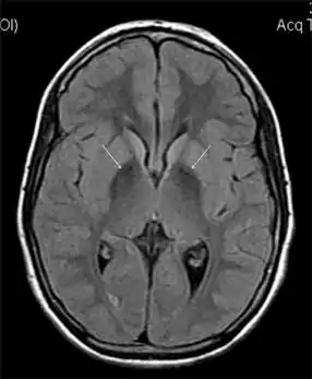 | MRI hypointensity (white arrows) in the globus pallidi that indicates the presence of iron deficiencies which would be seen in a diagnosis of Aceruloplasminemia | |