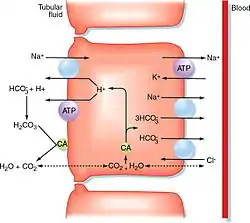 In short, under normal conditions, the net effect of carbonic anhydrase in the urinary lumen and cells of the proximal convoluted tubule is to acidify the urine and transport bicarbonate (HCO3) into the body. Another effect is excretion of Cl as it is needed to maintain electroneutrality in the lumen, as well as the reabsorption of Na+ into the body.