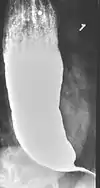 The patient swallows a barium solution, with continuous fluoroscopy (X-ray recording) to observe the flow of the fluid through the esophagus. Normal peristaltic movement of the esophagus is not seen. There is acute tapering at the lower esophageal sphincter and narrowing at the gastro-esophageal junction, producing a "bird's beak" or "rat's tail" appearance. The esophagus above the narrowing is often dilated (enlarged) to varying degrees as the esophagus is gradually stretched over time.[6] An air-fluid margin is often seen over the barium column due to the lack of peristalsis. A five-minutes timed barium swallow can provide a useful benchmark to measure the effectiveness of treatment.