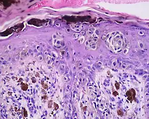 Melanoma is a group of serious skin cancers that arise from pigment cells (melanocytes); acral lentiginous melanoma is a kind of lentiginous[6] skin melanoma.[7][8] Acral lentiginous melanoma is the most common subtype in people with darker skins and is rare in people with lighter skin types. Acral lentiginous melanoma is observed on the palms, soles, under the nails and in the oral mucosa. It occurs on non-hair-bearing surfaces of the body, which have not necessarily been exposed to sunlight. It is also found on mucous membranes.[9] It is the most common form of melanoma diagnosed amongst Asian and sub-Saharan African ethnic groups.[10] The average age at diagnosis is between sixty and seventy years.[11]