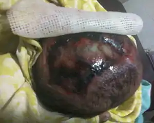 Acrania is a rare congenital disorder that occurs in the human fetus in which the flat bones in the cranial vault are either completely or partially absent.[1] The cerebral hemispheres develop completely but abnormally.[1] The condition is frequently, though not always, associated with anencephaly. The fetus is said to suffer from acrania if it meets the following criteria: the foetus should have a perfectly normal facial bone, a normal cervical column but without the fetal skull and a volume of brain tissue equivalent to at least one third of the normal brain size.[2]
