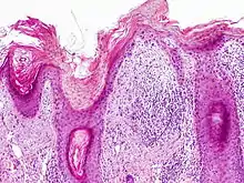 • Bowenoid: This term is controversial and usually refers to full-thickness atypia, microscopically indistinguishable from Bowen's Disease.[24] However most dermatologists and pathologists will use it in reference to tissue samples that are notable for small foci of atypia that involve the full thickness of the epidermis, in the background of a lesion that is otherwise consistent with an AK.[38]