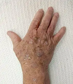 Actinic keratosis (AK), sometimes called solar keratosis or senile keratosis,[1][2] is a pre-cancerous[3] area of thick, scaly, or crusty skin.[4][5] Actinic keratosis is a disorder (-osis) of epidermal keratinocytes that is induced by ultraviolet (UV) light exposure (actin-).[6] These growths are more common in fair-skinned people and those who are frequently in the sun.[7] They are believed to form when skin gets damaged by UV radiation from the sun or indoor tanning beds, usually over the course of decades. Given their pre-cancerous nature, if left untreated, they may turn into a type of skin cancer called squamous cell carcinoma.[5] Untreated lesions have up to a 20% risk of progression to squamous cell carcinoma,[8] so treatment by a dermatologist is recommended.
