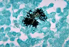 Actinomyces naeslundii is a Gram-positive, rod-shaped bacterium found in the mouth of humans. The species has been implicated in periodontal disease, as well as various tooth cavities.[1] In other cases, A. naeslundii is associated with good oral health. It is one of the first bacteria to occupy the oral cavity and colonize the tooth's surface. It has also been isolated from women with bacterial vaginosis.[2]
