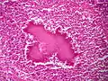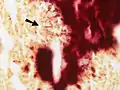 The disease is characterised by the formation of painful abscesses in the mouth, lungs,[3][4] breast,[5] or gastrointestinal tract.[2] Actinomycosis abscesses grow larger as the disease progresses, often over months. In severe cases, they may penetrate the surrounding bone and muscle to the skin, where they break open and leak large amounts of pus, which often contains characteristic granules (sulfur granules) filled with progeny bacteria. These granules are named due to their appearance, but are not actually composed of sulfur.