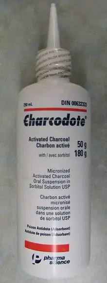 Activated charcoal, also known as activated carbon, is a medication used to treat poisonings that occurred by mouth.[1] To be effective it must be used within a short time of the poisoning occurring, typically an hour.[1][2] It does not work for poisonings by cyanide, corrosive agents, iron, lithium, alcohols, or malathion.[2] It may be taken by mouth or given by a nasogastric tube.[3] Other uses include inside hemoperfusion machines.[1]