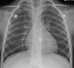 In more than 90% of cases, the cause is a viral infection.[1] These viruses may be spread through the air when people cough or by direct contact.[2] Risk factors include exposure to tobacco smoke, dust, and other air pollution.[2] A small number of cases are due to high levels of air pollution or bacteria such as Mycoplasma pneumoniae or Bordetella pertussis.[1][9] Diagnosis is typically based on a person's signs and symptom.[4] The color of the sputum does not indicate if the infection is viral or bacterial.[1] Determining the underlying organism is typically not needed.[1] Other causes of similar symptoms include asthma, pneumonia, bronchiolitis, bronchiectasis, and COPD.[1][7] A chest X-ray may be useful to detect pneumonia.[1]