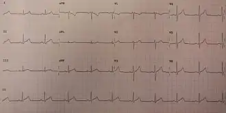| An ECG showing pericarditis. Note the ST elevation in multiple leads with slight reciprocal ST depression in aVR. | |