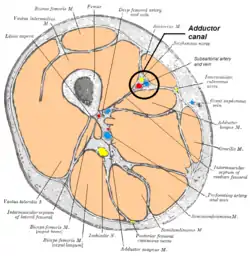 The canal contains the subsartorial artery (superficial femoral artery), subsartorial vein (superficial femoral vein), and branches of the femoral nerve (specifically, the saphenous nerve, and the nerve to the vastus medialis).[1][2] The femoral artery with its vein and the saphenous nerve enter this canal through the superior foramen. Then, the saphenous nerve and artery and vein of genus descendens exit through the anterior foramen, piercing the vastoadductor intermuscular septum. Finally, the femoral artery and vein exit via the inferior foramen (usually called the hiatus) through the inferior space between the oblique and medial heads of adductor magnus.[3]