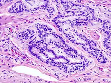 Adenocarcinoma[1] (/ˌædɪnkɑːrsɪˈnmə/; plural adenocarcinomas or adenocarcinomata /ˌædɪnkɑːrsɪˈnmɪtə/) (AC) is a type of cancerous tumor that can occur in several parts of the body. It is defined as neoplasia of epithelial tissue that has glandular origin, glandular characteristics, or both. Adenocarcinomas are part of the larger grouping of carcinomas, but are also sometimes called by more precise terms omitting the word, where these exist. Thus invasive ductal carcinoma, the most common form of breast cancer, is adenocarcinoma but does not use the term in its name—however, esophageal adenocarcinoma does to distinguish it from the other common type of esophageal cancer, esophageal squamous cell carcinoma. Several of the most common forms of cancer are adenocarcinomas, and the various sorts of adenocarcinoma vary greatly in all their aspects, so that few useful generalizations can be made about them.