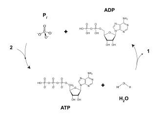 ADP can be interconverted to adenosine triphosphate (ATP) and adenosine monophosphate (AMP). ATP contains one more phosphate group than does ADP. AMP contains one fewer phosphate group. Energy transfer used by all living things is a result of dephosphorylation of ATP by enzymes known as ATPases. The cleavage of a phosphate group from ATP results in the coupling of energy to metabolic reactions and a by-product of ADP.[1] ATP is continually reformed from lower-energy species ADP and AMP. The biosynthesis of ATP is achieved throughout processes such as substrate-level phosphorylation, oxidative phosphorylation, and photophosphorylation, all of which facilitate the addition of a phosphate group to ADP.