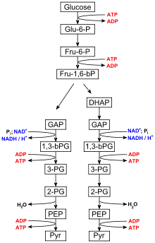 - Glucose + 2 NAD+ + 2 Pi + 2 ADP → 2 pyruvate + 2 ATP + 2 NADH + 2 H2O