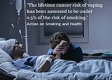 The use of electronic cigarettes (vaping) carries many health risks, especially for children, young adults, and pregnant women.[1][2] The risk depends on the composition of electronic cigarette aerosol, which varies according to the contents of the liquid, the physical and electrical design of the device, and user behavior.[notes 1][4] As of 2019, the long-term risks of vaping are uncertain because it is a relatively new technology,[notes 2][6][7][8][9] although the long-term risks of some individual substances in vaping aerosols have been studied. In United Kingdom vaping is considered to be around 95% less harmful than tobacco in a landmark review by Public Health of England[10]