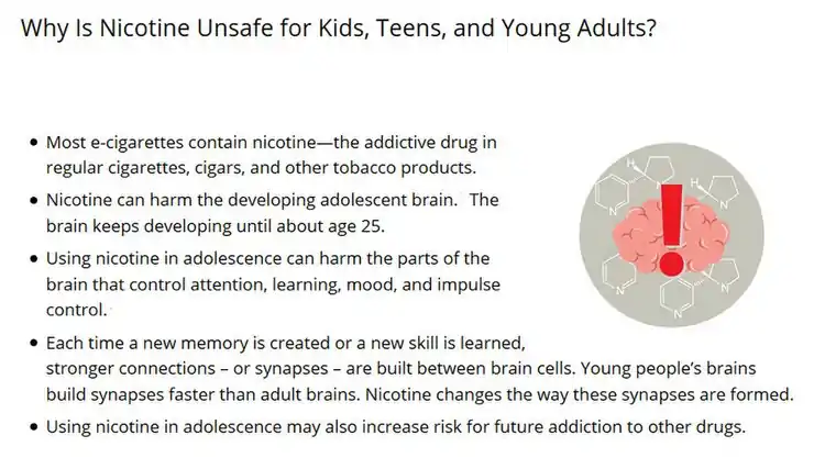 A serious concern regarding vaping is that they could entice children to initiate smoking, either by the argument that nicotine leads to smoking or by making smoking appear more acceptable again.[46] Concerns exist in respect to adolescence vaping due to studies indicating nicotine may potentially have harmful effects on the brain.[47]