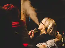 E-cigarette vapor has a different composition than cigarette smoke, and can have lower levels of some toxic chemicals.[11][6][12][13][14] E-cigarettes reduce lung function, reduce cardiac muscle function, and increase inflammation, but to a much lower extent than with traditional cigarettes.[15] However, vaping has some hazards that cigarette smoking does not. For example, the deadly 2019–20 vaping lung illness outbreak in North America was likely primarily caused by vitamin E acetate in THC-containing vaping liquid, and other as-yet-unidentified chemicals may also cause vaping-associated pulmonary injury.[16] The relationship between nicotine vaping and tobacco smoking is an area of active study and debate, including the relative health risk, whether electronic cigarettes should be promoted as a less harmful alternative to smoking or a means to quit nicotine entirely, and whether or not the availability of electronic cigarettes recruits more people into nicotine dependence. Medically-approved and closely-regulated forms of nicotine replacement therapy such as nicotine patches, nicotine gum, and nicotine lozenge avoid the hazards of inhaling chemical byproducts entirely. Nicotine vaping produces more carcinogens and toxic substances than a medically-approved nicotine inhaler.[17] Health concerns extend to nearby people inhaling the vapor exhaled by others, in the same way as second-hand smoke.[18]