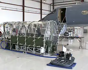 The modular ABCS utilizes a transit isolator consisting of a metal frame supporting numerous items of medical equipment (heart and pulse oxygen monitors, etc.). Most of airframe’s cabin space is taken up by the isolator. The framework is encased in a transparent plastic sheathing, or “tent”. Only one patient—attended by one doctor and two nurses—can be accommodated in one isolator in one aircraft. The patient area is provided with continuous negative air pressure and air filtration to keep pathogens from entering the rest of the cabin. An antechamber to the patient area is used by medical personnel for donning and doffing personal protective equipment as well as for decontamination. Next to the isolator is a toilet for the patient’s use.