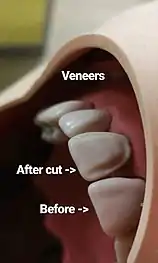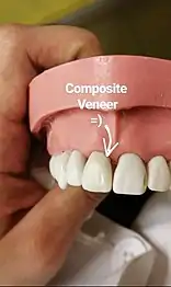 Dental veneers covers the front surface of teeth. Veneers with direct resins are one of the common treatment options for clinical applications following the developments in adhesive and restorative dentistry in recent years. These restorations are applied on prepared tooth surfaces or even without any preparation, with an adhesive agent and a composite resin material directly in a single visit in the dental clinic.[21] If done properly, the aesthetic outcomes of direct composite veneers are very satisfactory in addition to superior optical and physical properties.[21] In recent history these restorations were thought to be temporary alternatives to indirect ceramic veneers; however, they are no longer named 'day savior fillings' today. These restorations are called minimally invasive, functional and long-lasting 'direct aesthetic restorations' that perfectly emulate natural dental tissues even in anterior area.[22][23] 3,4 Discolorations of teeth or restorations, dental malformations or mal-positions, diastemas, crown fractures and abrasive or erosive defects are some examples of up-to-date indications of direct composite veneers.[21] 1 Enamel hypoplasia is a developmental malformation generally resulting in poor aesthetics, tooth sensitivity, malocclusion and predisposition to dental caries.[24] 5 Direct composite veneer restorations where the whole labial surface is covered with resin, are good treatment options in such cases.,6[25] The conventional workflow sequence of a direct composite veneer is 1) Determine if composite veneers is the best option for the patient. Advantage of composite veneers is it takes much less time compared to a lab-fabricated veneer, it only takes one treatment for the preparation and veneer buildup. Secondly it is a cheaper option compared to other veneer options. 2)choosing of the composite shade. Composite button samples of different shades are placed on teeth and a dental photography taken 3)impression and cast taken, wax up done on teeth, a silicone index guidance is fabricated 4)rubber dam as isolation 5)preparation is done by drilling of a thin layer of tooth structure. depth grooves are used to make the preparation more uniformed. 6)composite layering with dentin color, and the incisal area with enamel color 6) finishing with white stone bur, taking care to follow the natural anatomy of adjacent teeth if present 7) polishing with interdental strip and polishing disk with grains of increasing fineness, finally with a composite polishing paste 8)follow up with the patient regularly[3]