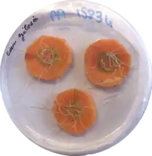 The hairy roots are grown in vitro in bioreactors to study their soil interaction with other pathogens like fungi and nematodes. This technique has also led to the commercial production of certain metabolic compounds that the plant is known to secrete, especially in regard to the medicinal plants that are difficult to cultivate in sufficient quantities by other means.[5] The root cultures are also used for genetic engineering.[6][7]